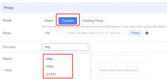 2. In the "Proxy" section, select "Custom" for mode, press the drop-down menu and select HTTPS, HTTP or Socks5 protocol