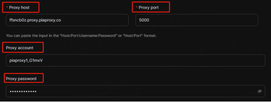 • Username and password authentication: When you choose this authentication method, you need to fill in the obtained proxy address, subaccount username and password when configuring the proxy.