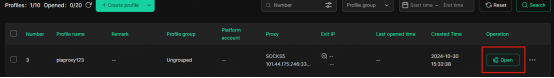 6. In the "Profile Management" tab, you will see the profile you created. Press the "Open" button to start the browser profile.