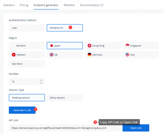 • IP whitelist: When you choose this authentication method, you can fill in the API link or get the IP address and port by opening the link when configuring the proxy.