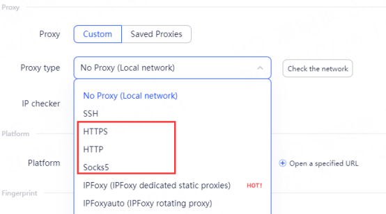 2. In the "Proxy Type" section, press the drop-down menu and select HTTPS, HTTP, or Socks5 protocol