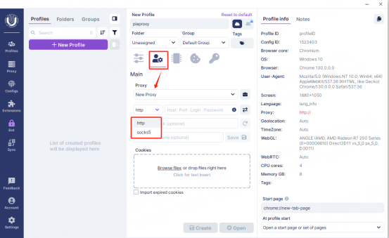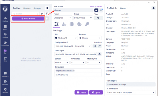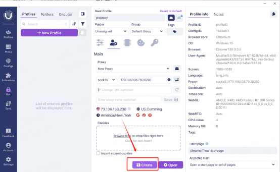 5. After the settings are completed, click the "Create" button at the bottom of the window to save the profile settings.