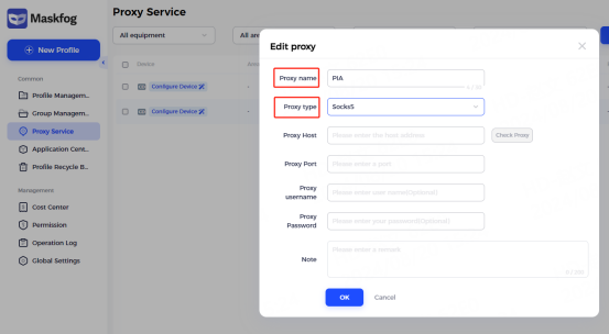 3. Enter the proxy name and select the proxy type - socks5