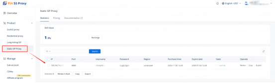 After logging in, go to the "Personal Center" page, find the static ISP proxy you purchased, and make sure to record the following information: IP, Port, Username, Password
