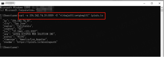 2. Test command: [curl -x IP:port -U "Username:Password" ipinfo.io]