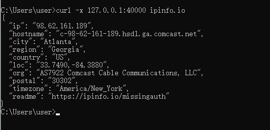 Test command: curl -x 127.0.0.1:40000 ipinfo.io